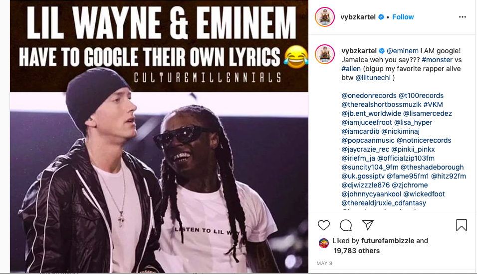 While sharing an image of Weezy and Eminem talking about how they have to Google their own lyrics when recording new songs to make sure they haven’t said them in the past, the Jamaican reggae dancehall artist had the following to say: