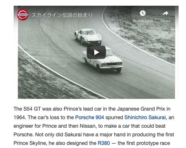 The S54 GT was also Prince’s lead car in the Japanese Grand Prix in 1964. The car’s loss to the Porsche 904 spurred Shinichiro Sakurai, an engineer for Prince and then Nissan, to make a car that could beat Porsche. Not only did Sakurai have a major hand in producing the first Prince Skyline, he also designed the R380 — the first prototype race car developed by Prince in postwar Japan. It was inspired by the 904’s mid-engine layout and featured a highly-aerodynamic custom-built body, and was also used to break five E-class land speed records in late 1965. In 1966, Prince raced four of its mid-engined R380s in the Japanese Grand Prix against three Porsche 906s — Prince cars placed first and second. This would be the last time Prince would appear on the race track however, as in 1966 it merged with Nissan.