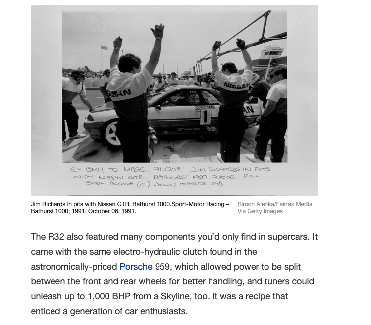 Nissan beat Porsche time and time again in Group A class races (a series of production-derived vehicles intended for outright competition in touring car racing and rallying). However, Nissan was so successful in Group A races that racing moderators were indirectly forced to change the rules and requirements, following the marque’s winning streak between 1989 and 1993 in the Japanese Touring Car Championship. In 1991, Australia became the GT-R’s first export market and went on to dominate the Australian Bathurst racing series, leaving Australian V8 race cars and the Ford Sierra Cosworth (an outright winner in European Group A races and a cult ‘80s car) in its dust — in turn becoming what Australian press referred to as “Godzilla,” likening it to a Japanese monster.