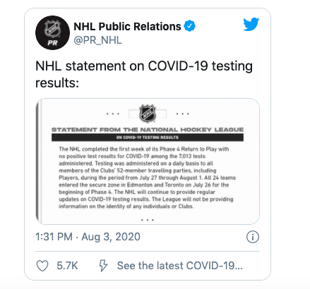 [NHL PR] Zero positive tests during the first week of Phase 4. (7013 tests)