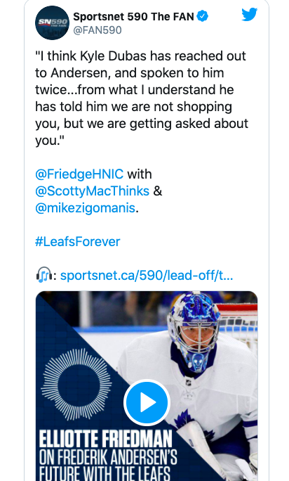 “I think Kyle Dubas has reached out to Andersen, and spoken to him twice…from what I understand he has told him we are not shopping you, but we are getting asked about you.”