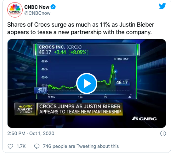 As mentioned above, in the minutes after Bieber’s announcement Crocs stock jumped seven to eight percent before reaching an 11 percent increase, trading at a peak of $47.81 USD on October 1. As of 10:34 AM E.T. on October 2, Crocs is trading at $45.33 USD per share.