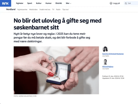 From January 1st 2025, Marriage between cousins, or uncles/aunts with nieces/nephews are banned in Norway. Marriages between close relatives that have been entered abroad will also not be recognized if one of the parties is a Norwegian citizen or resident in Norway.