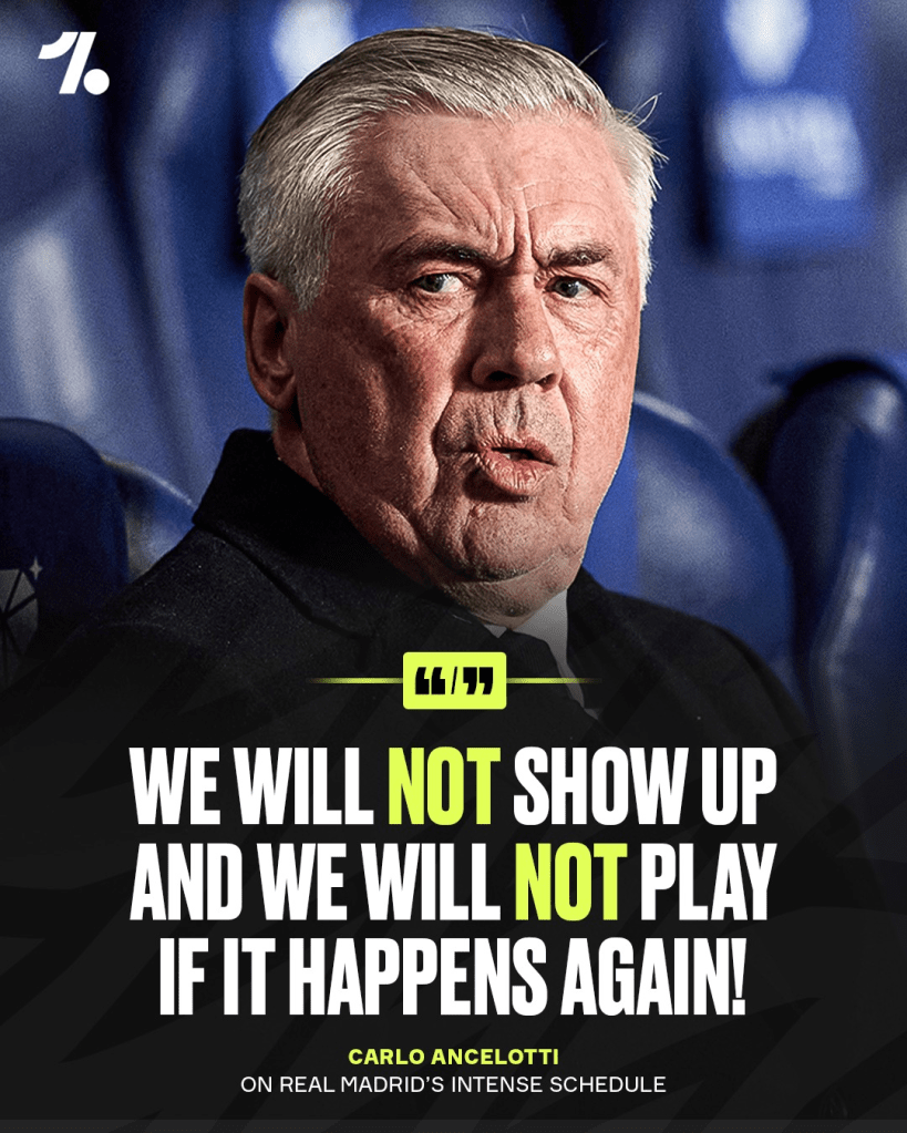 Carlo Ancelotti March 16, 2025 skinnypagesx Carlo Ancelotti: “This is the last time we played a game without 72 hours of rest.” Real Madrid have made it clear to LaLiga that they will NOT play another game if it’s scheduled less than 72 hours after their previous match source facebook Share this: Click to share on X (Opens in new window) X Click to share on Facebook (Opens in new window) Facebook Click to share on Pinterest (Opens in new window) Pinterest Like Loading... Related
